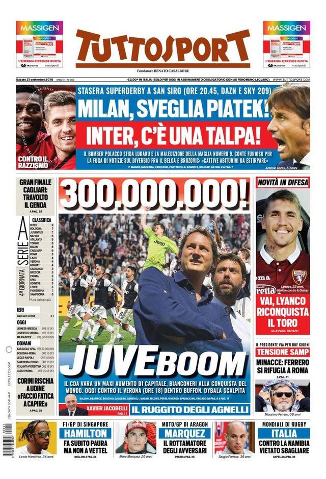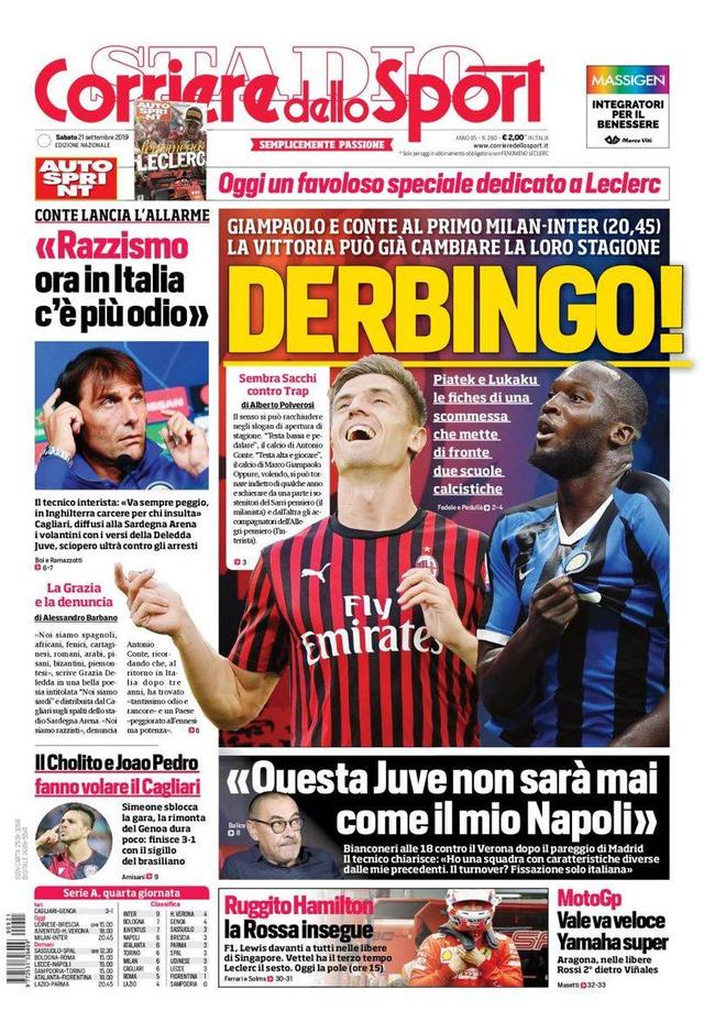 罗马体育报:德比的游戏,詹保罗和孔蒂的第一次米兰德比。获胜能改变他们各自的赛季。米兰射手皮亚特克和国米新射手卢卡库,他们是这场强强对话中不同足球流派射手之间较量的赌注筹码。