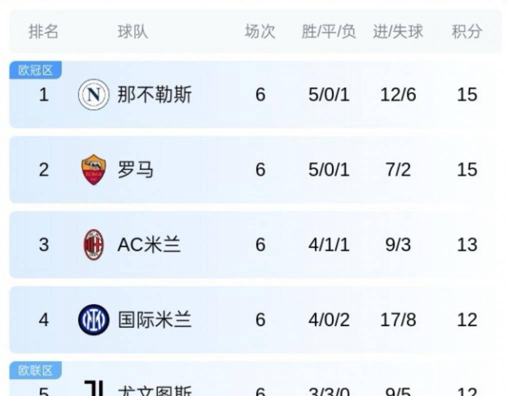 随着意甲第6轮的结束,最新的积分榜也出炉。罗马客场以2-1战胜佛罗伦萨,那不勒斯在逆转战胜热那亚后也登上了积分榜首的位置。而米兰与尤文的平局使得两队继续保持在前三名之间,分别排名第三和第四。尤文则暂时位列第五。