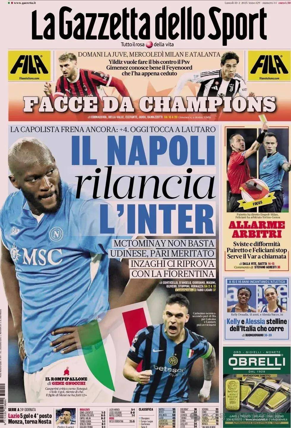 2、那不勒斯再次被国际米兰逼停。领先优势缩小到4分,今天轮到劳塔罗发挥。麦克托米奈的进球尚不足以取胜,乌迪内斯配得上一场平局。小因扎吉再次尝试对阵佛罗伦萨。