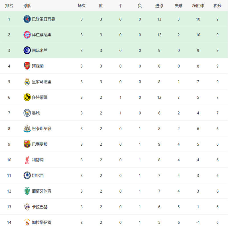 上赛季的前八名中,利物浦和阿斯顿维拉在第三轮后都已全胜,积9分排名最高。阿森纳、国际米兰和勒沃库森则是2胜1平积7分,巴塞罗那和里尔则为2胜1负积6分。最特殊的是马德里竞技,前三场只赢了一场,最后5场全胜,最终挤进前八名。由此可见,除了马竞外,其他7支前八的球队在第三轮时至少积6分,这意味着今年16分的可能性较大。因此,我们可以初步推测,本赛季晋级前八的球队,很多目前应该已经有6分。接下来我们看看目前已经有6分以上的球队,晋级的形势如何。