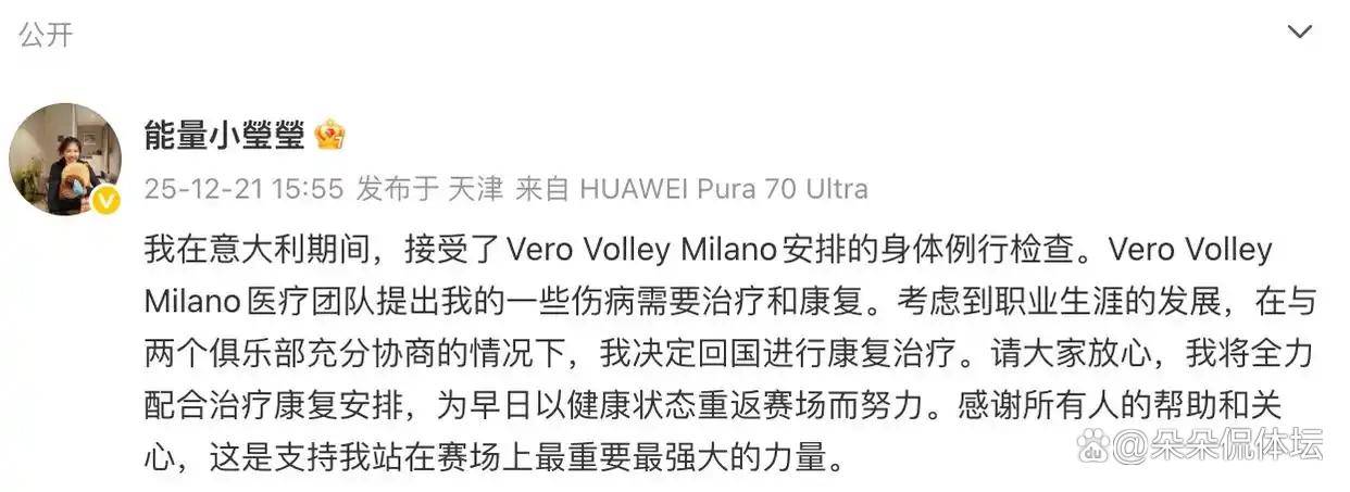 这是2025年12月初的一次深度体检,距离米兰俱乐部高调官宣中国女排主攻手李盈莹加盟仅过去一个月。原本例行公事的入队检查,意外成为了职业生涯的转折点。