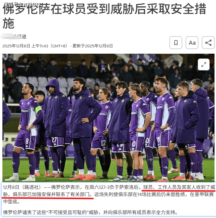 由于战绩糟糕,佛罗伦萨的球员、甚至家属都收到了极端威胁,俱乐部不得不加强安保并请求当局介入。(如下图)